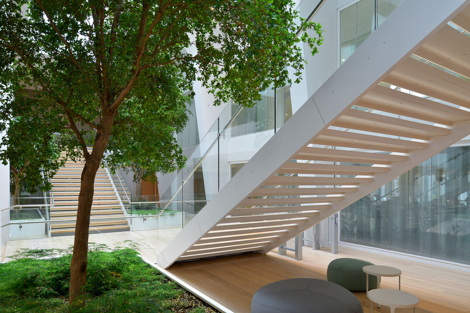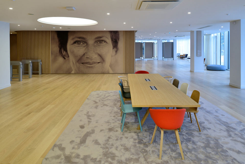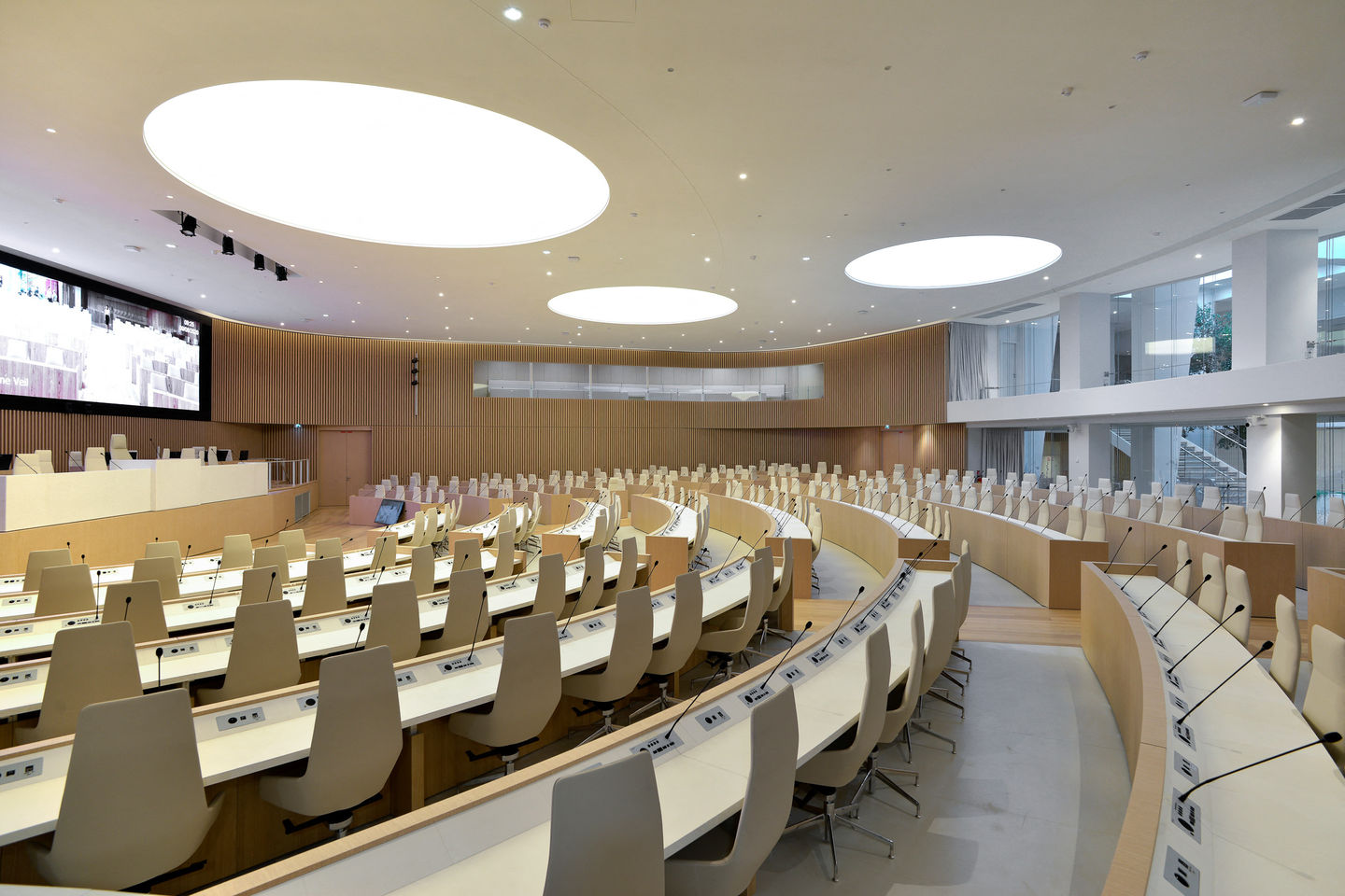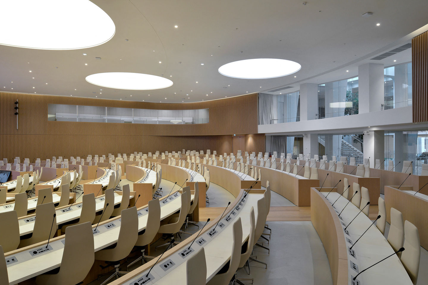 Le Conseil régional d’Île-de-France, jusqu’alors disséminé sur 16 sites parisiens, regroupe ses activités et son siège en une implantation unique, dans le programme de bureaux « Influence » en Seine-Saint-Denis. Quelque 1 500 agents déjà installés en 2019 dans l’immeuble Influence 1 ont été rejoints par le reste des équipes ainsi que par la présidence, dans l’immeuble Influence 2 abritant le nouvel hémicycle. Le programme consistait à aménager les deux étages constituant le « socle » du bâtiment pour y installer l’hémicycle Simone Veil, les espaces d’accueil et de réception du public, des journalistes et des élus, ainsi que des espaces d’expositions et une salle polyvalente modulable. Dès l’entrée, par la perception de l’hémicycle à travers une large baie vitrée, le projet offre une image d’ouverture et de transparence. Au droit d’une verrière centrale, l’ouverture – de 16 m de large en double hauteur – baigne la salle de lumière naturelle et offre une vue sur le jardin intérieur. Dans l’hémicycle, l’espace est d’une grande fluidité : une large courbe enveloppe la salle d’un mouvement ample, épousant les alcôves des loges, des tribunes du public et de la presse. Un ruban de chêne clair au motif de lames verticales – fil conducteur de l’aménagement intérieur – habille également les espaces de réception et le foyer des élus. L’architecture intérieure favorise l’apport de lumière naturelle et offre un cadre apaisant à ce lieu de débats souvent passionnés.