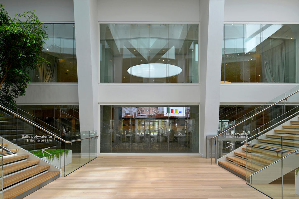 Lieu : Immeuble Influence 2, 2 rue Simone Veil, Saint-Ouen, Seine-Saint-Denis / Maître d'ouvrage : Conseil régional d’Île-de-France / Maître d’œuvre : Claude Denu & Christian Paradon, architectes, mandataire / Jean-Marc Malvezin, chef de projet, Mario Manini, Arnaud Pellaton, Amandine Riss / Aménagements intérieurs F. Bolenor / BET : BeA Groupe Pingat / Acousticien : R. Raskin, Capri acoustique / BET Lumière : Lightec Concept / BET Audiovisuel : Atelier Audiovisuel / Programme : Aménagement du rez-de-chaussée et du 1er étage de l’immeuble Influence 2 / Création et aménagement des espaces d’accueil, espace lounge, salle d’expositions, salles de réunions, salle polyvalente, bars et espaces cuisine, hémicycle de 250 places assises, tribune présidentielle, tribune du public, tribune presse, foyer des élus, locaux techniques, conception et réalisation du poste de contrôle avancé / Superficie : 4 600 m² SDP / Coût : 14,5 M€ / Calendrier : Concours 2017 – Projet lauréat – Livraison 2020